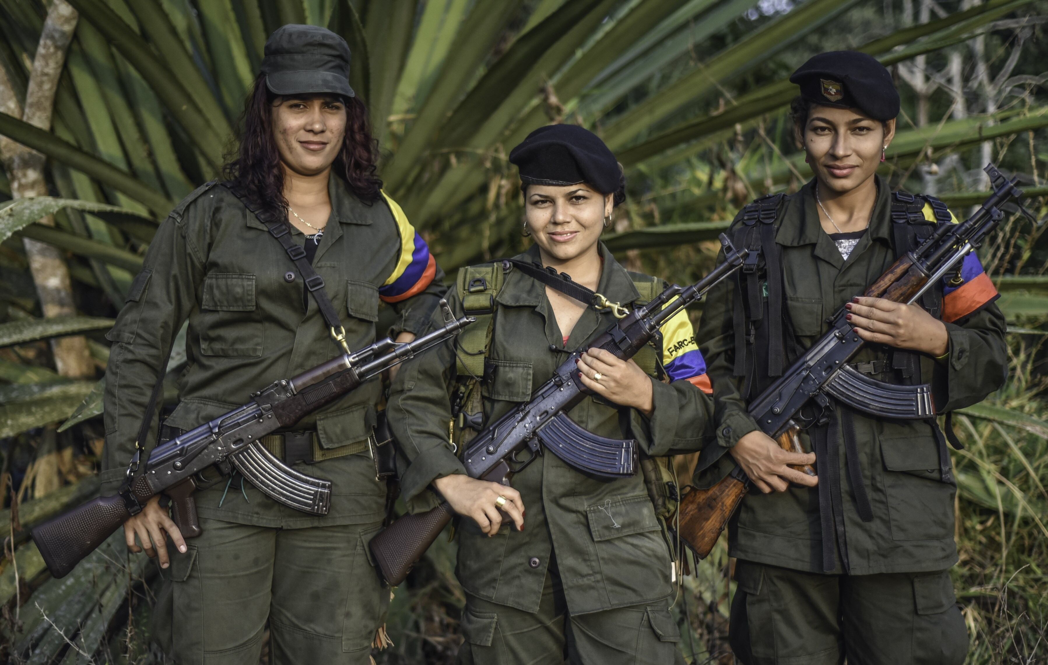 De izquierda a derecha, Luisa, Manuela y Rosmira, integrantes de las Fuerzas Armadas Revolucionarias de Colombia (FARC), posan para una foto en un campo en las montañas de Colombia. (AFP)