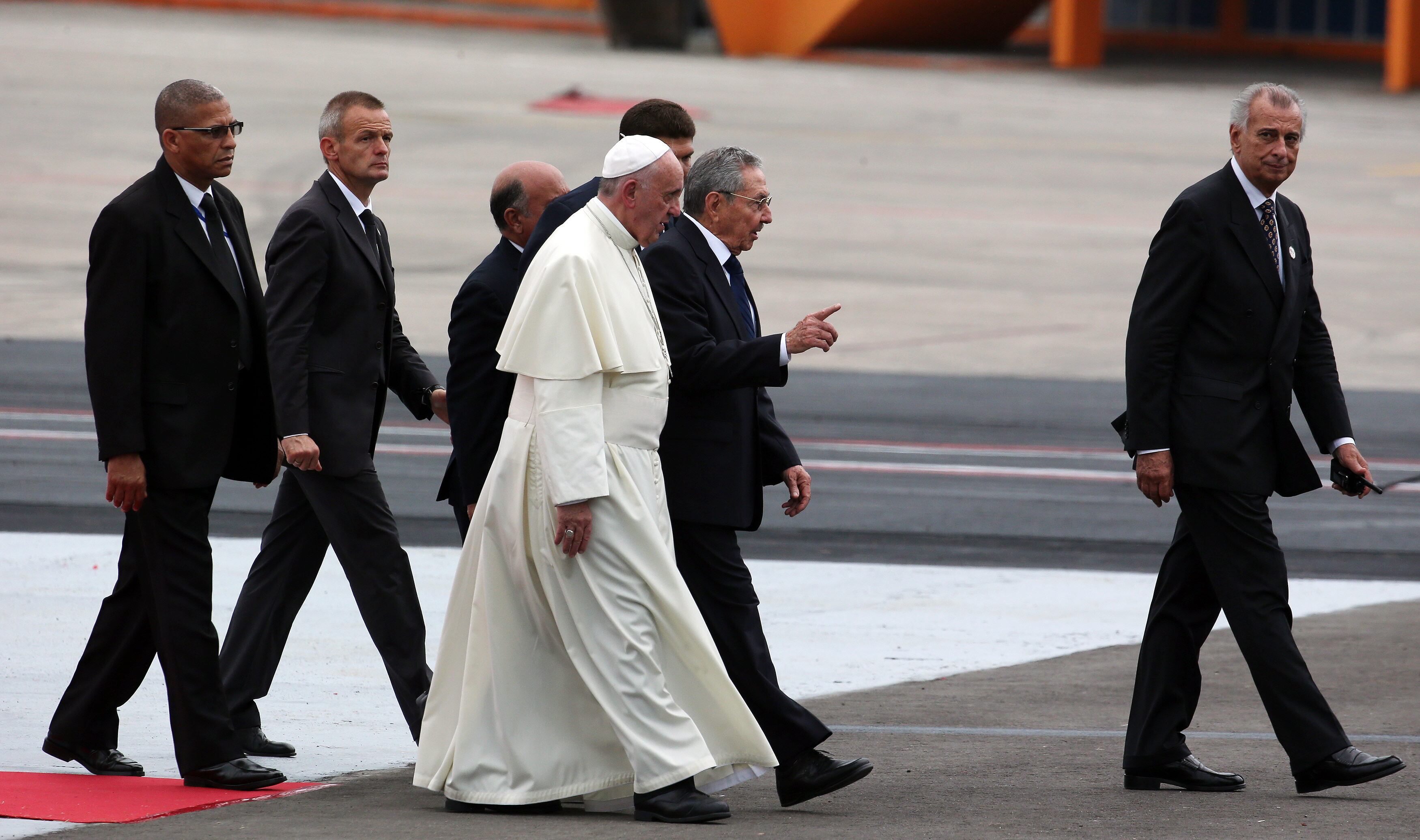 El papa Francisco (i) es recibido por el presidente de Cuba, Raúl Castro, el sábado 19 de septiembre de 2015, en La Habana, Cuba, para una visita apostólica de 4 días, en un viaje que también le llevará a Estados Unidos, los dos países que contaron con su apoyo para lograr restablecer sus relaciones diplomáticas. (EFE/Alejandro Ernesto)