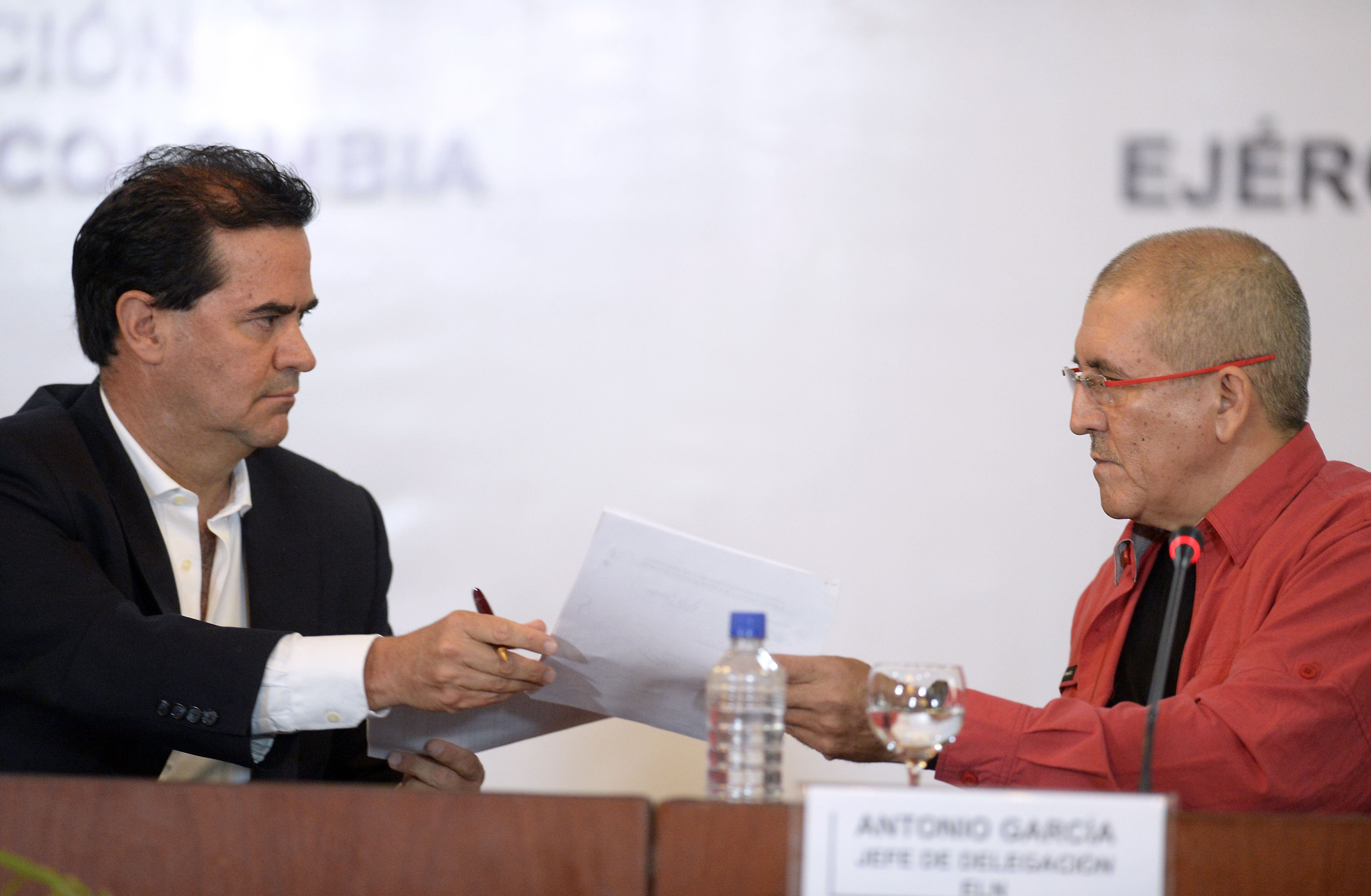 El anuncio fue hecho en la sede de la cancillería venezolana en Caracas por Frank Pearl (izq.), jefe de la delegación del gobierno del colombiano, y el jefe del ELN, Antonio García. (AFP)