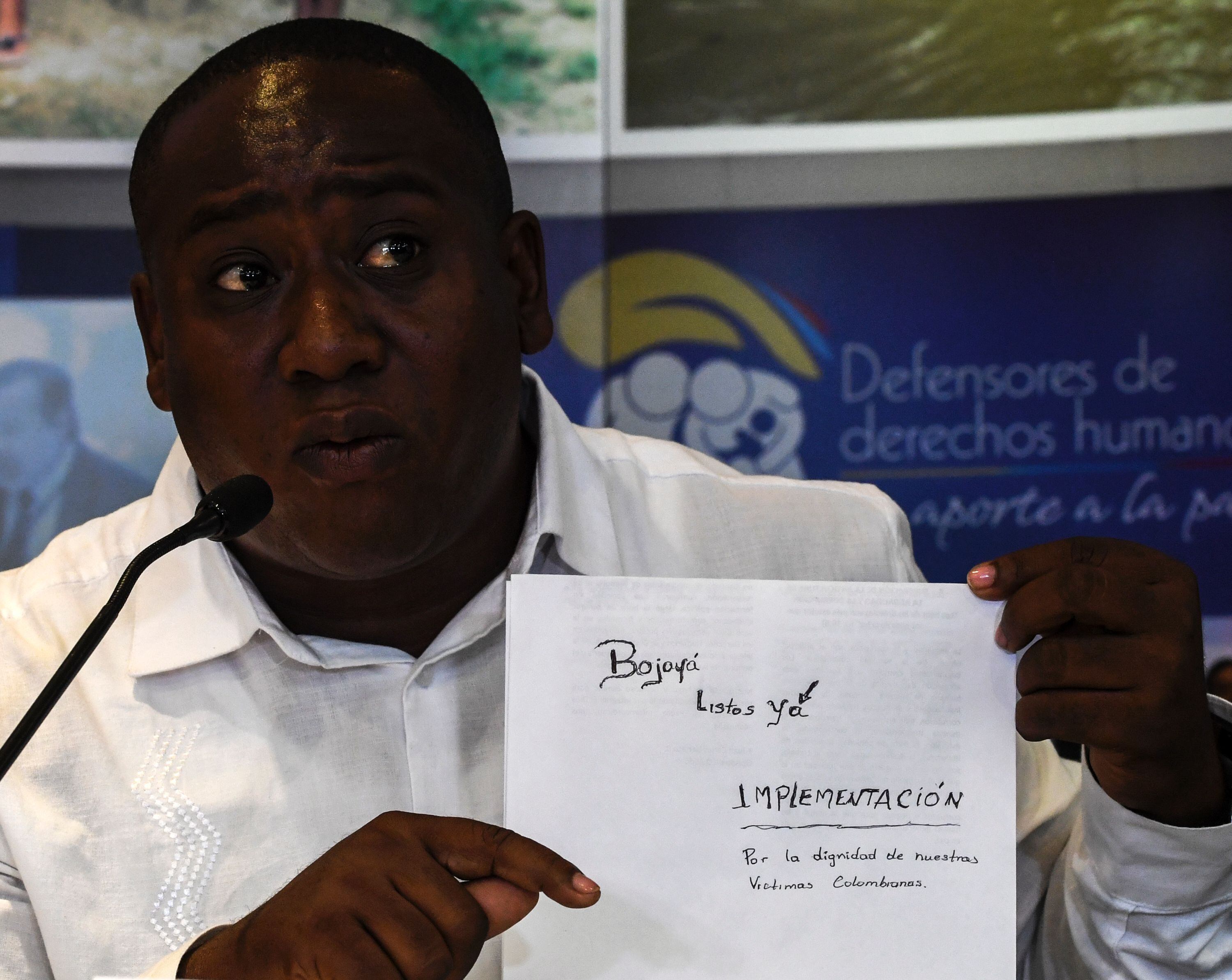 "Cada día que pasa es una amenaza (...) nosotros consideramos que no podemos seguir esperando más los asuntos de la construcción de la paz en nuestros territorios", afirmó Leyner Palacios, representante de las víctimas de la masacre de Bojayá, donde en el 2002 murieron 79 personas que se refugiaban en una iglesia de enfrentamientos entre las FARC y grupos paramilitares.