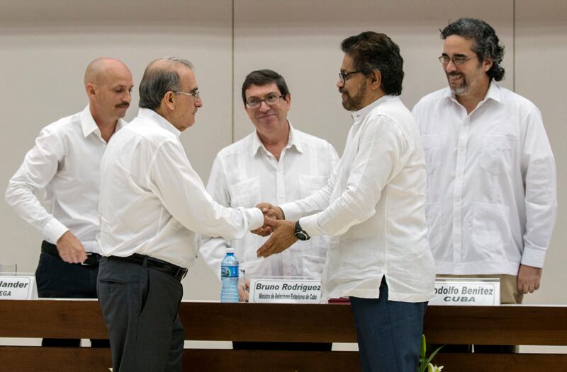 El acuerdo, de 63 páginas, lo suscribieron Iván Márquez y Humberto de la Calle, jefes de los equipos negociadores de las Fuerzas Armadas Revolucionarias de Colombia (FARC) y el Gobierno, respectivamente, en presencia de representantes de Cuba y Noruega, garantes del proceso, y de las víctimas, que viajaron a La Habana para respaldar el histórico pacto.