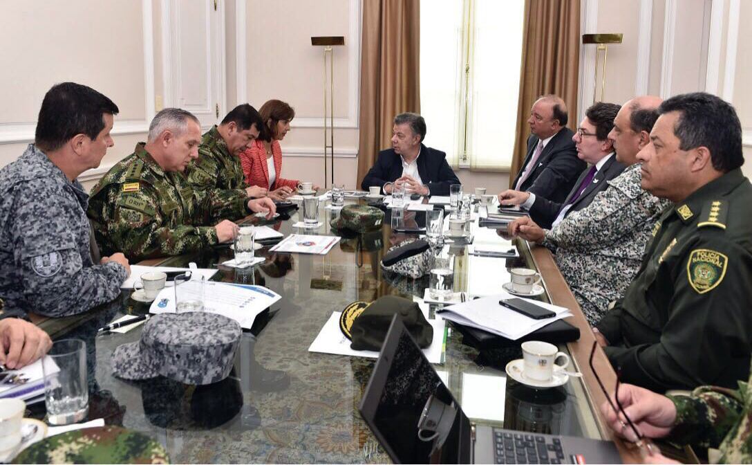 El presidente Juan Manuel Santos (centro) presidió una reunión en Bogotá con la canciller, María Ángela Holguín; el ministro de Defensa, Luis Carlos Villegas (primero a la derecha) y miembros de la Policía Nacional y de las fuerzas del Ejército para revisar información sobre la incursión militar venezolana en el departamento de Arauca, cerca de la frontera entre ambos países. (STR)