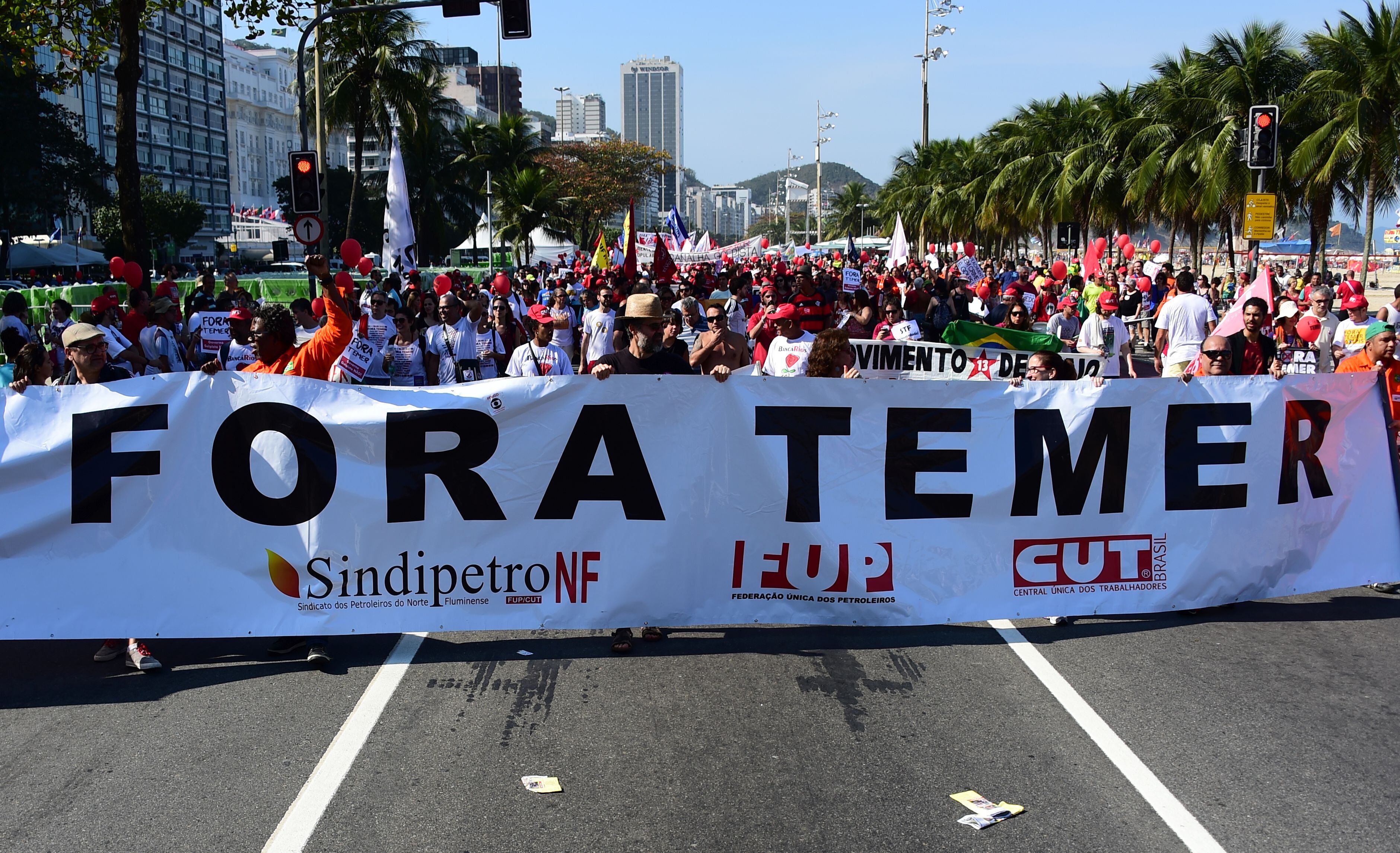 "No a las Olimpíadas", "Fuera Temer" y "Fuera todos", estaba escrito en algunos de los carteles que portaban las personas congregadas frente al lujoso hotel Copacabana Palace el viernes, a pasos del estadio olímpico de vóley playa, frente a las miradas de cientos de turistas e integrantes de delegaciones de todas partes del mundo.