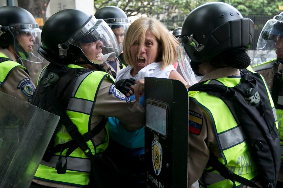 Una manifestante forcejeaba el miércoles con policías que impedían el avance de los opositores hacia la sede del Consejo Nacional Electoral en Caracas. (AP)