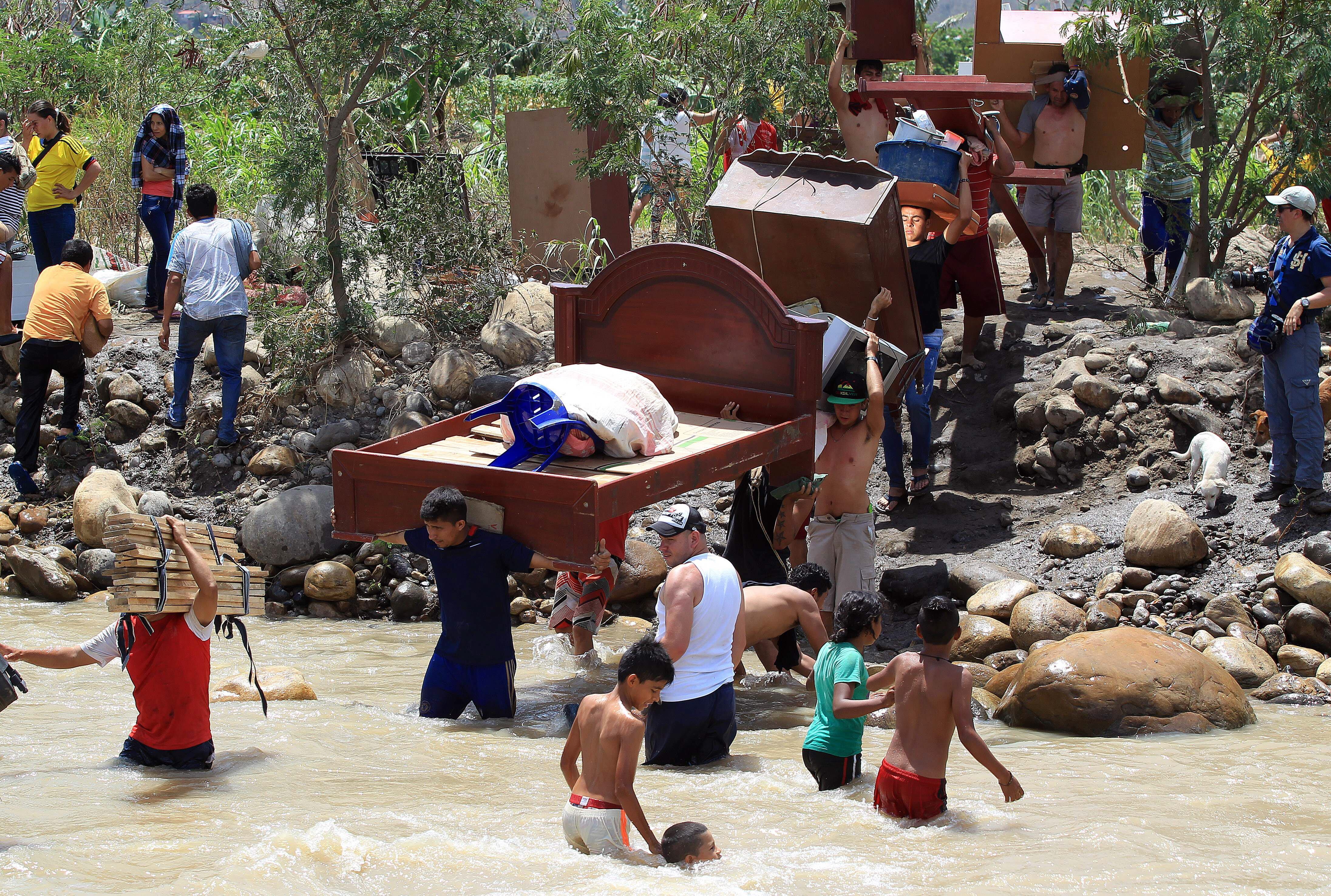 Decenas de colombianos cargan sus pertenencias por el río Táchira desde Venezuela hacia el sector La Parada. (EFE.)