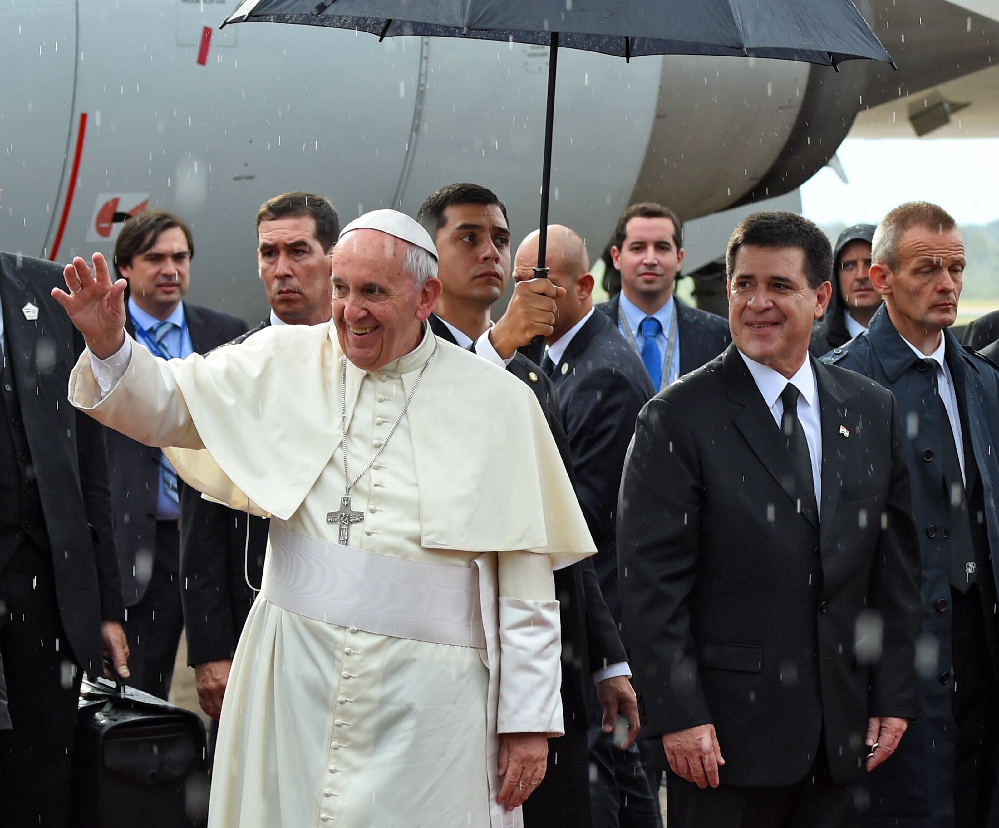 Esperado por el presidente Horacio Cartes, Francisco descendió del avión bajo un aguacero sin protegerse por un paraguas hasta que estrechó las manos de las autoridades paraguayas.