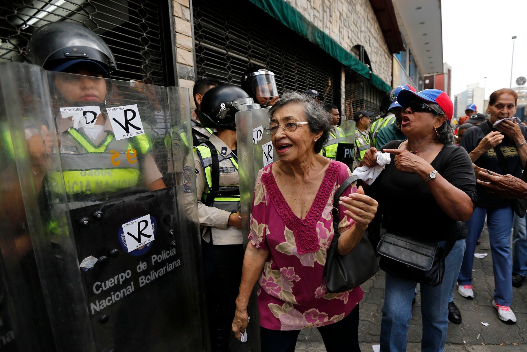 Adultas mayores pasaban el viernes frente a un destacamento de policías durante la 'marcha de los abuelos' en Caracas. (AP)