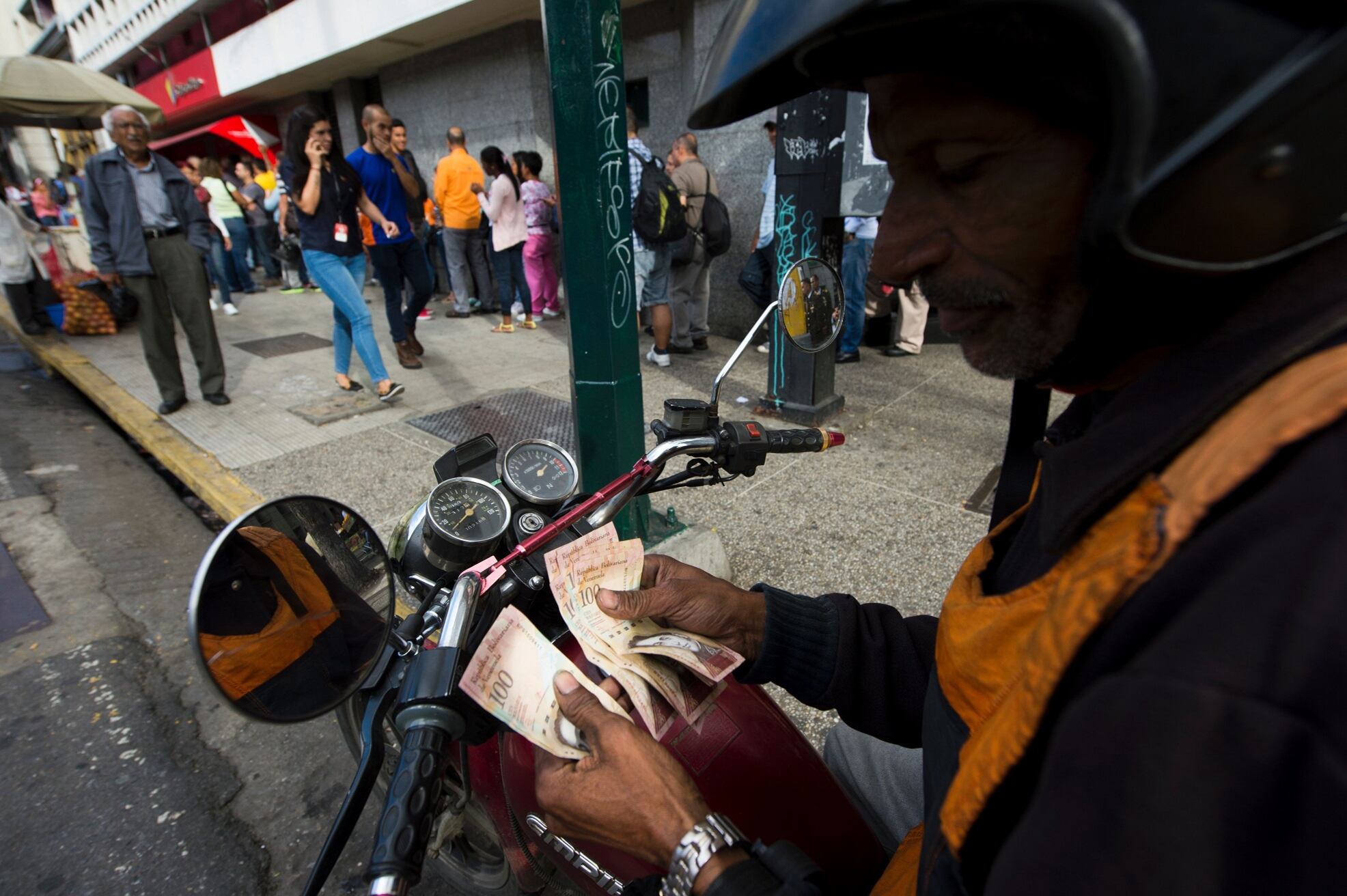 Un venezolano contaba el jueves billetes de 100 bolívares mientars esperaba poder depositarlos en un banco en Caracas. (AFP)