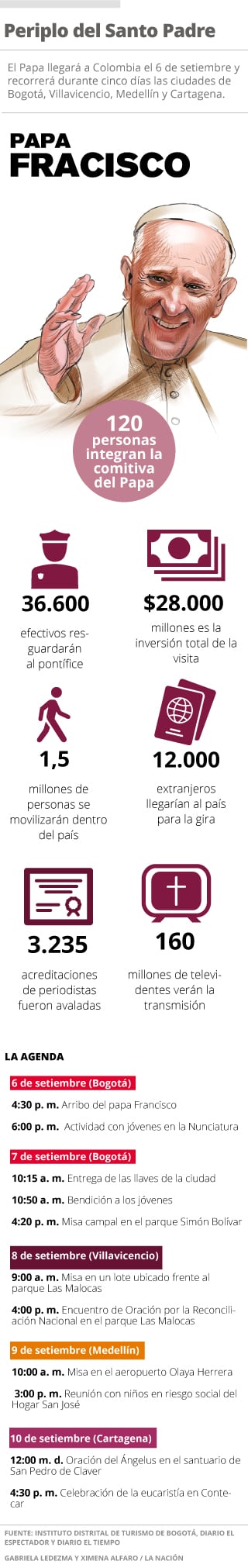 La gira papal se prolongará por cuatro días, hasta el 10 de setiembre, e incluye visitas a las ciudades de Bogotá, Villavicencio, Medellín y Cartagena, en las que oficiará misas, se reunirá con jerarcas de la Iglesia, beatificará a dos sacerdotes y tendrá una cita con víctimas y actores del conflicto interno. Es el único viaje que hará en la región este año.