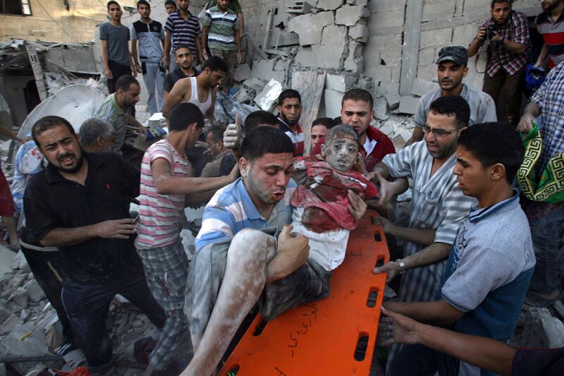 Palestinos evacuaban –el 3 de agosto del 2014– a un niño que resultó herido en un bombardeo de Israel contra un barrio de la ciudad de Rafah, en el sur de la franja de Gaza. | AP (Eyad Baba)