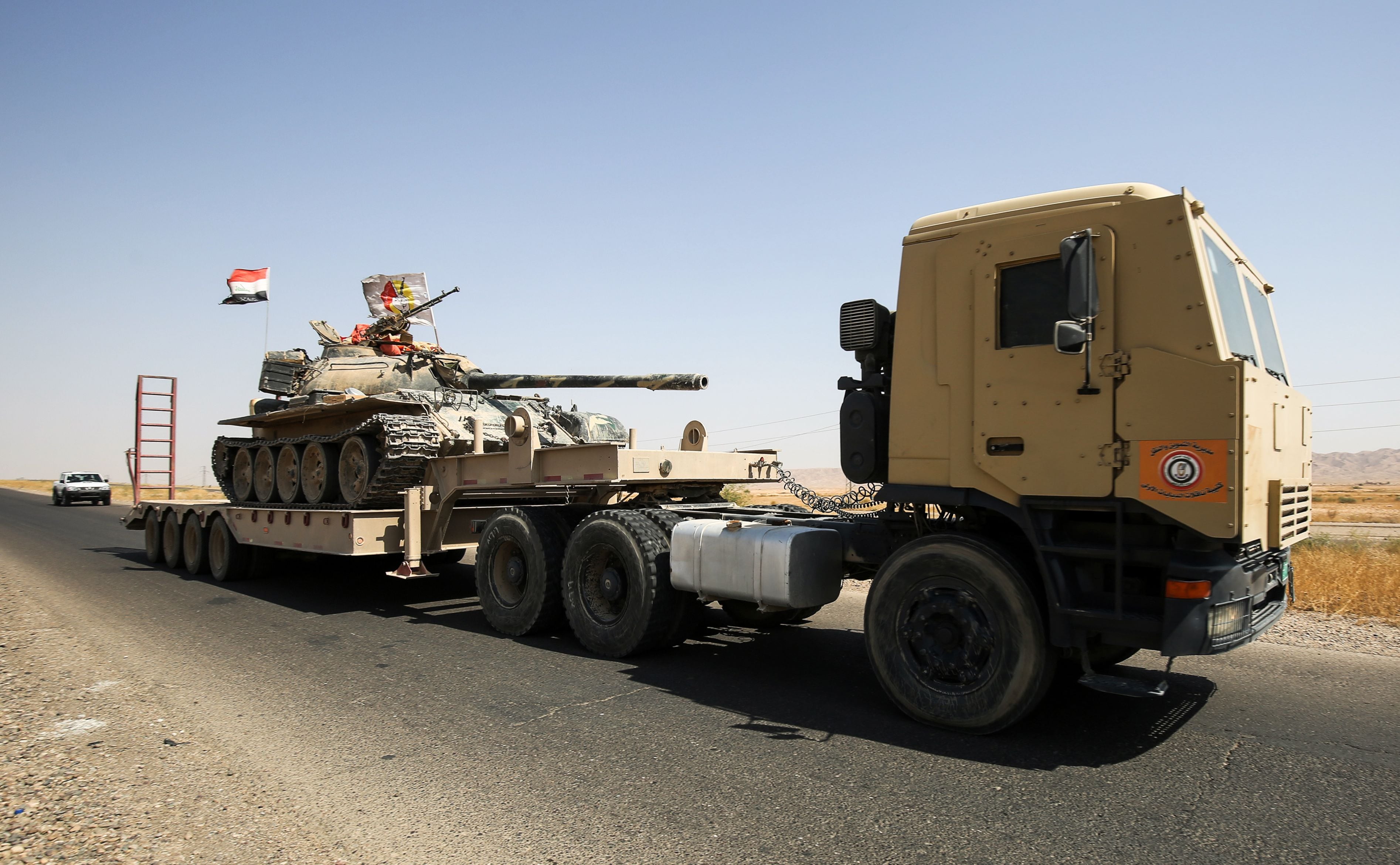 Un tanque T-54 de fabricación rusa perteneciente al grupo paramilitar Hashed al-Shaabi (Movilización Popular) es remolcado fuera de la ciudad norteña de Tal Afar el 31 de agosto, después de que el primer ministro iraquí declaró que las fuerzas gubernamentales y sus aliados retomaron la ciudad y la región circundante. (AFP)