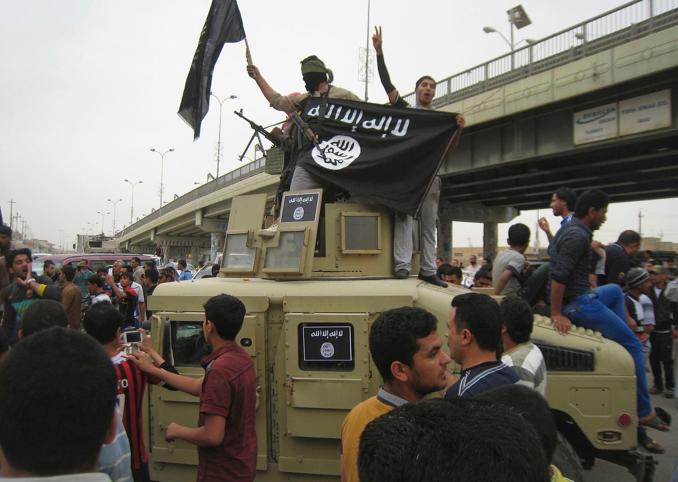 Los militantes del grupo Estado Islámico sostienen una bandera mientras patrullan en un vehículo militar en Irak, el 30 de marzo del 2014. (AP)