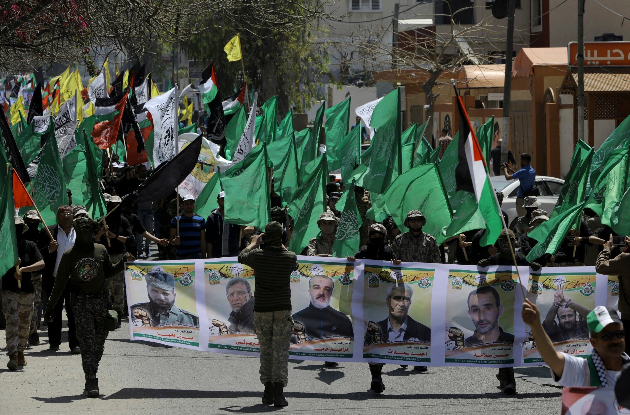 Miembros de las Brigadas Izzedine al-Qassam, brazo armado de Hamás, mrcharon el lunes en la Ciudad de Gaza en apoyo a la huelga de presos palestinos en Israel. (AP)
