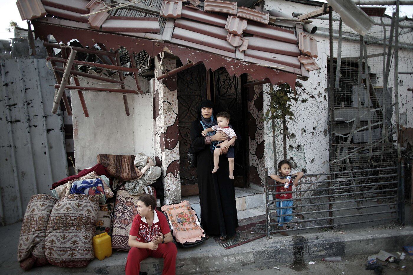Una familia palestina espera un vehículo para trasladarse a un refugio en una escuela de la ONU tras abandonar su casa en escombros en el barrio de Shejaiya, en la ciudad de Gaza. (AFP)