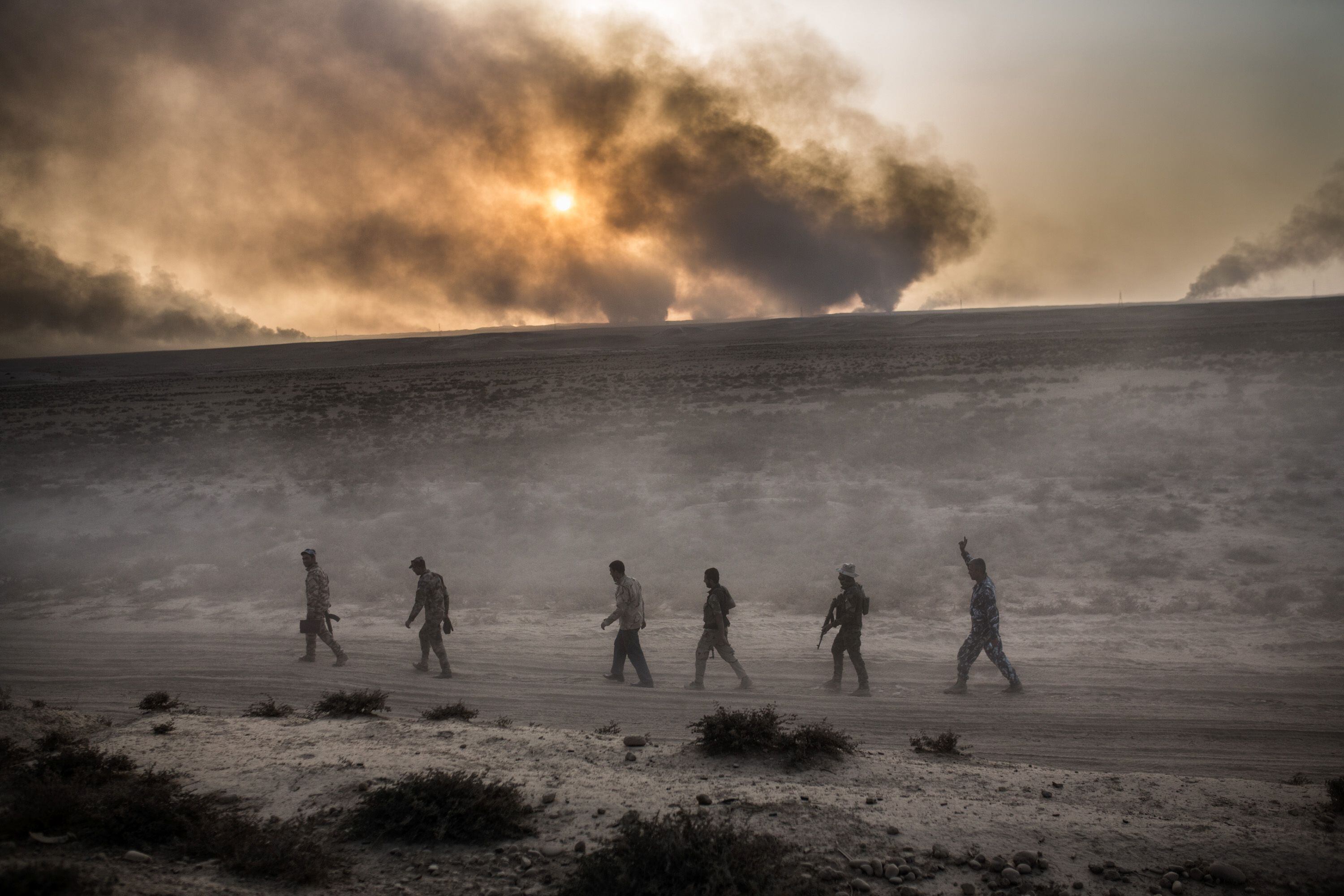 Soldados iraquíes pasan por una carretera mientras el humo sale del área de Qayyarah, unos 60 kilómetros al sur de Mosul, durante una operación, este miércoles 19, contra el grupo terrorista Estado Islámico. (AFP)