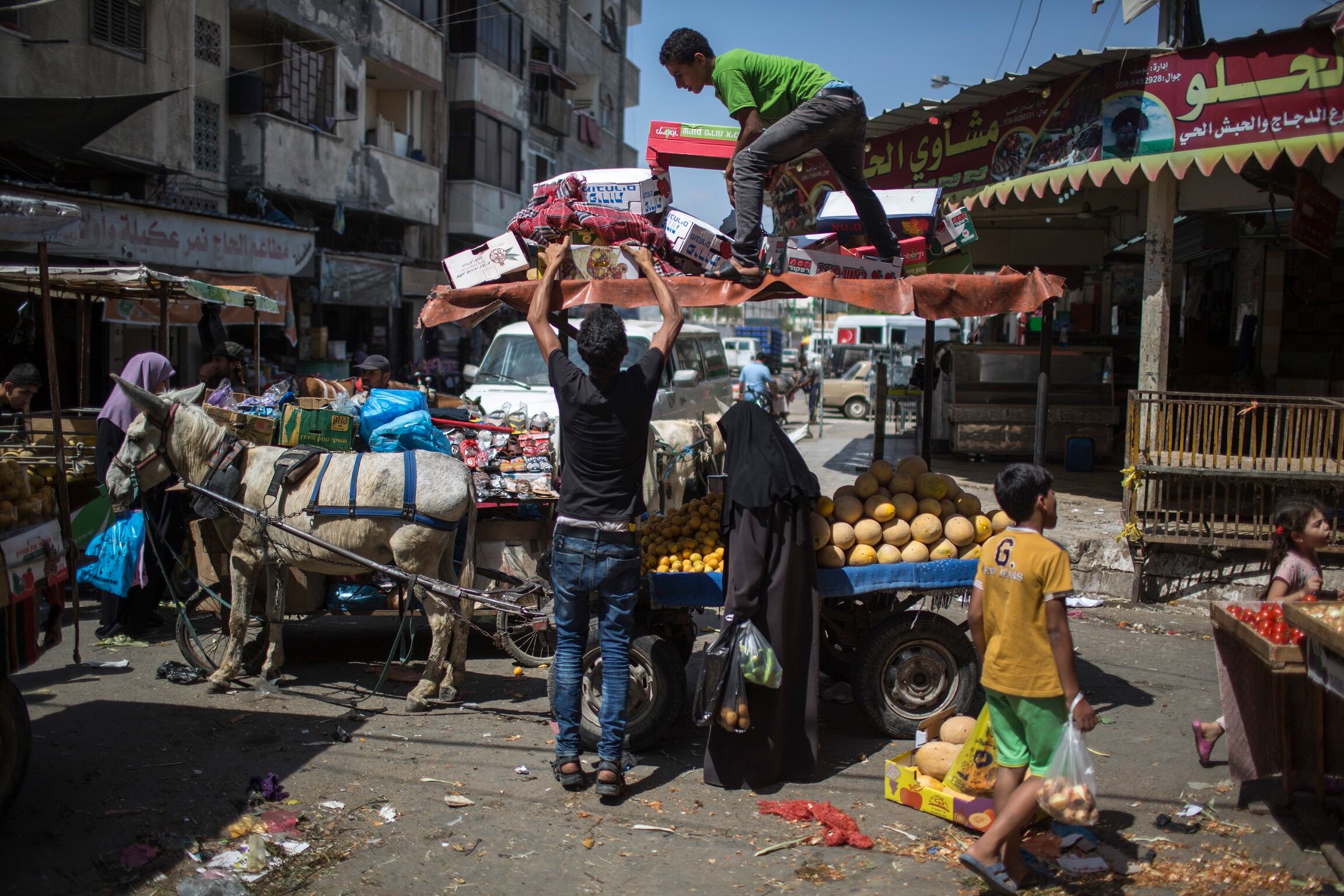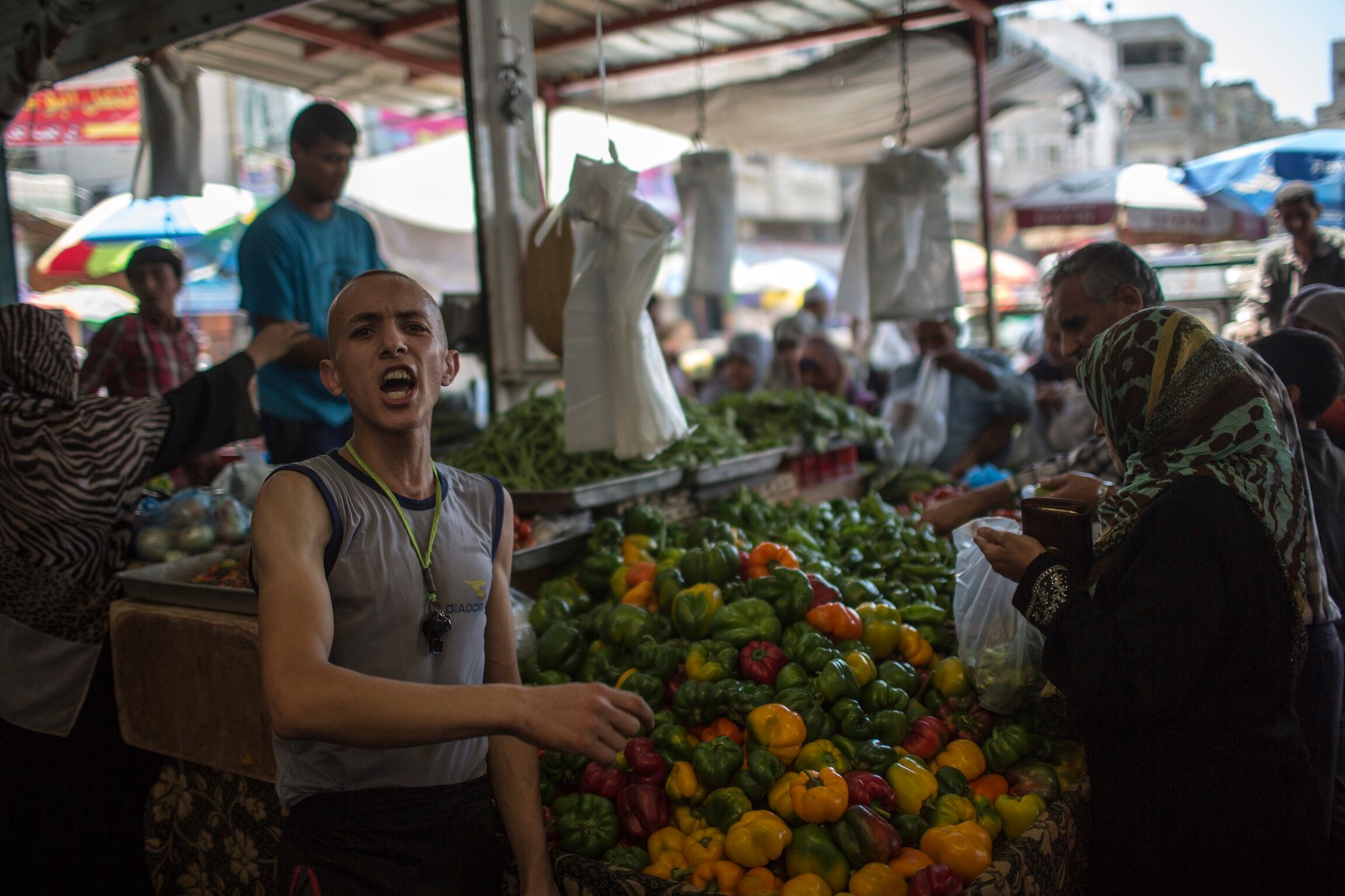 Un joven palestino promociona sus productos en un mercado de la franja de Gaza, donde el desempleo es uno de los problemas más graves. (Wissam Nassar/The New York Times)