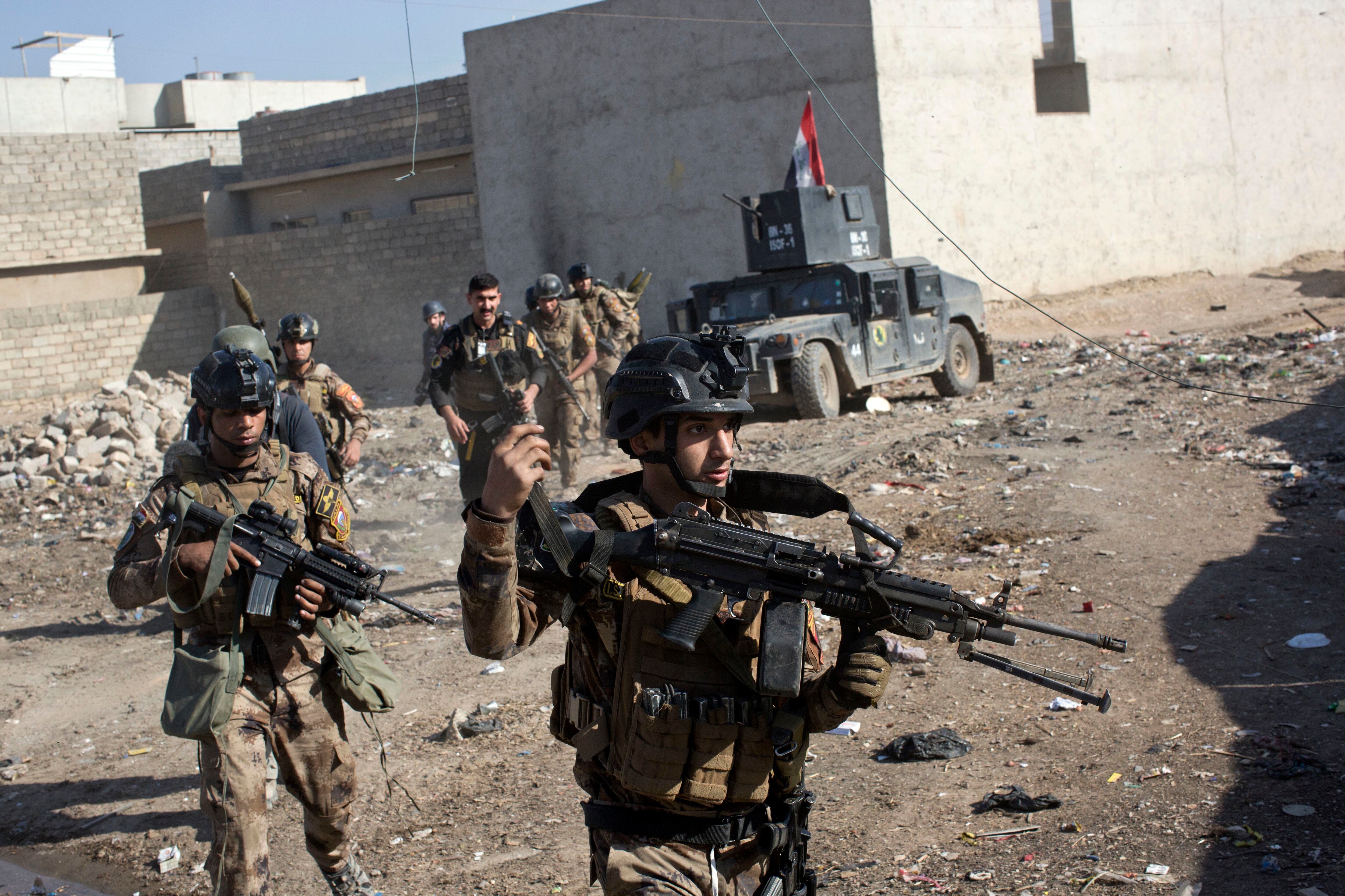Fuerzas especiales iraquíes se mueven en formación por una calle en las afueras de Mosul, este viernes 4 de noviembre. (AP)