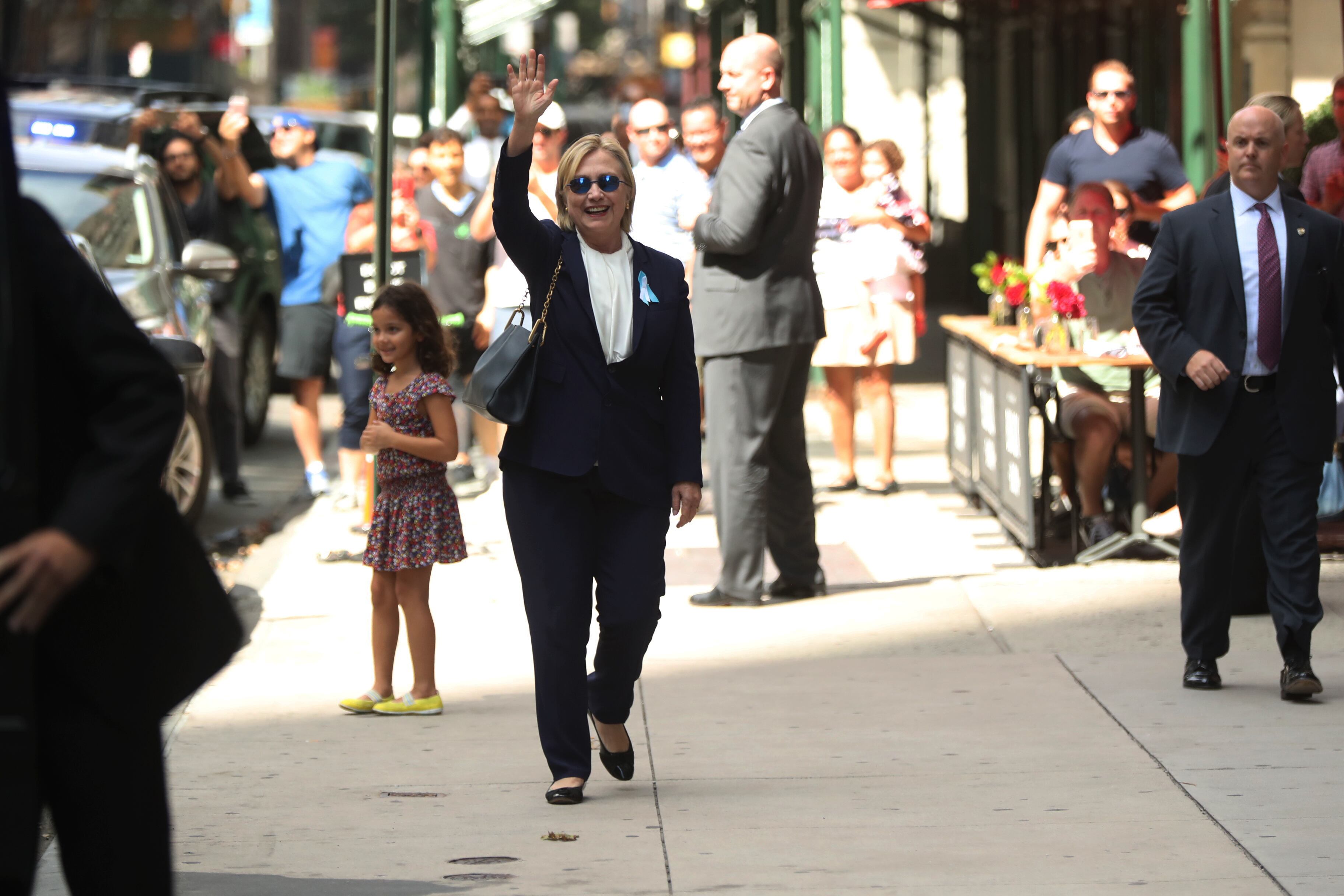 Clinton saludó este domingo a la prensa al salir del departamento de su hija en Nueva York, donde recibió atención médica tras el malestar que se le presentó en la ceremonia del 11 de setiembre. (AP)