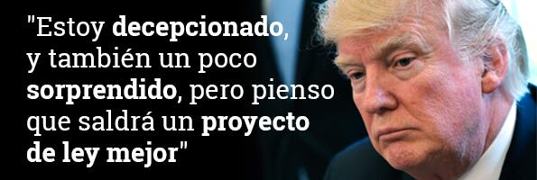 "Nunca dije que la revocaría y reemplazaría en 64 días", aseguró un abatido pero aún combativo Trump en la Casa Blanca, aunque durante su campaña presidencial gritó en repetidas ocasiones que la legislación sería derogada desde el primer día de su mandato.