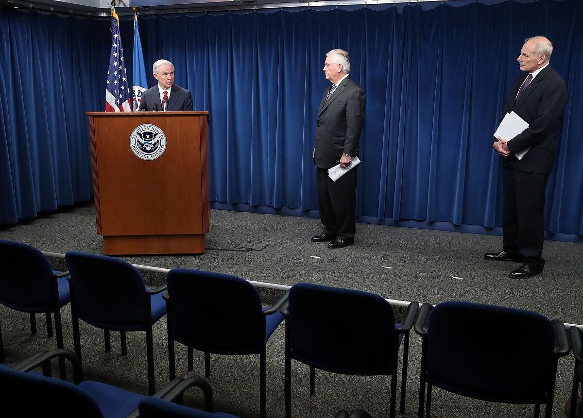 En esta ocasión, el mandatario se saltó su habitual ceremonia pública. En su lugar, el gobierno eligió a los secretarios de Seguridad Interior, John Kelly; de Estado, Rex Tillerson, y de Justicia, Jeff Sessions, como rostros públicos de la medida durante un breve anuncio ante la prensa.