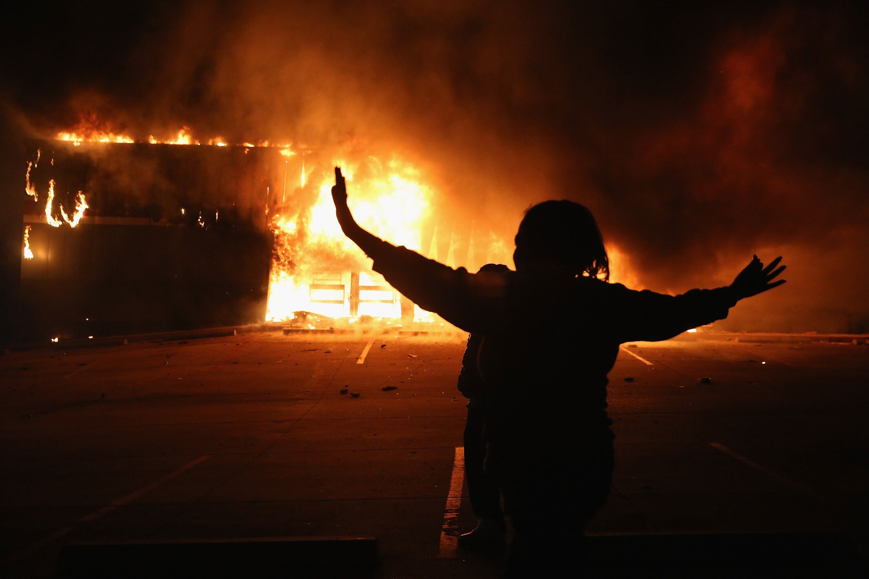 Los asistentes allí destrozaron coches de la Policía y edificios, se agarraron a barricadas y se burlaron de los agentes con insultos el lunes por la noche, mientras la policía les lanzaba botes de humo y gas lacrimógenos. Se escucharon disparos en las calles y los incendios de extendieron.