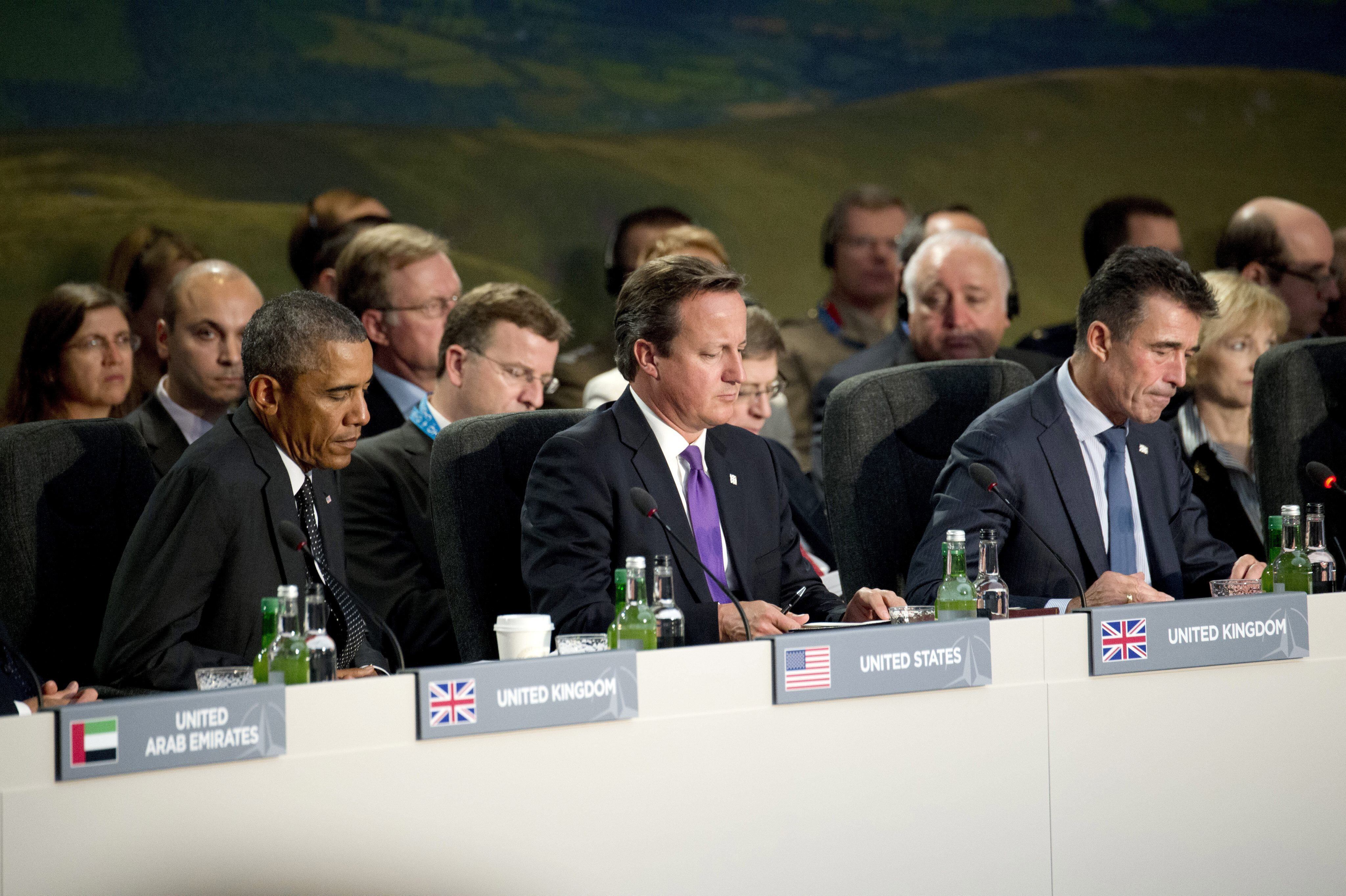 El presidente estadounidense, Barack Obama (i), el primer ministro británico, David Cameron (c), y el secretario general de la OTAN, Anders Fogh Rasmussen (d), durante la cumbre bianual donde discuten sobre temas de Afganistán, Irak y el Estado Islámico. (Efe)