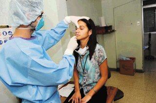 Los doctores Andrey Sebianne y Leandra Abarca muestran cómo se toma una muestra de casos sospechosos de gripe AH1N1, en la clínica Jiménez Nuñez, ubicada en Guadalupe centro. | CARLOS GONZÁLEZ (carlos gonz‡lez carballo)