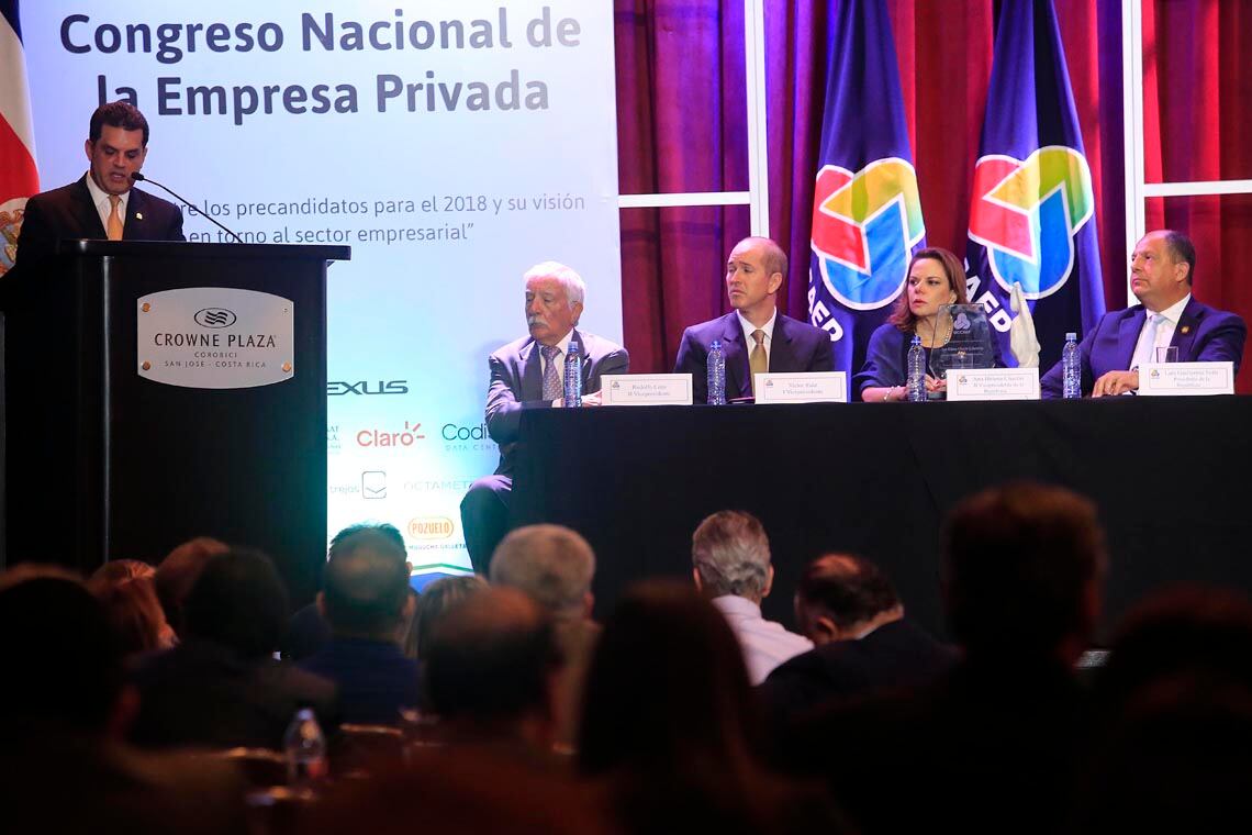 Franco Pacheco (a la izquierda), presidente de la Uccaep, ofrece un discurso en el que criticó la decisiones del presidente Luis Guillermo Solís (a la derecha) sobre empleo público. Al medio, Rodolfo Coto, segundo vicepresidente de Uccaep; Víctor Ruiz, primer vicepresidente de Uccaep; y Ana Helena Chacón, segunda vicepresidenta de la República. (Rafael Pacheco)
