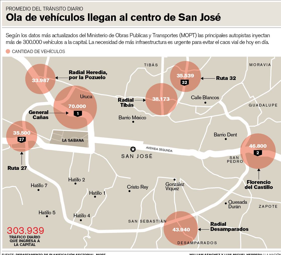 Más de 304.000 vehículos están forzados a pasar a diario por el centro de San José, a falta de rutas alternas para ir directamente de un extremo al otro de la ciudad o, en algunos casos, de una provincia a otra.