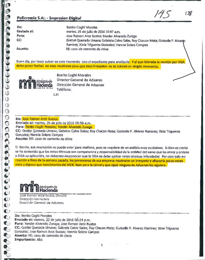 "En reunión a fines de la semana pasada, los personeros de esa empresa (Sinocem Costa Rica) mostraron un irrespeto y altanería pocas veces visto y dijeron que funcionarios del MEIC iban para la cárcel y que ojalá ninguno de Aduanas los siguiera", relató Arce a sus superiores jerárquicos.