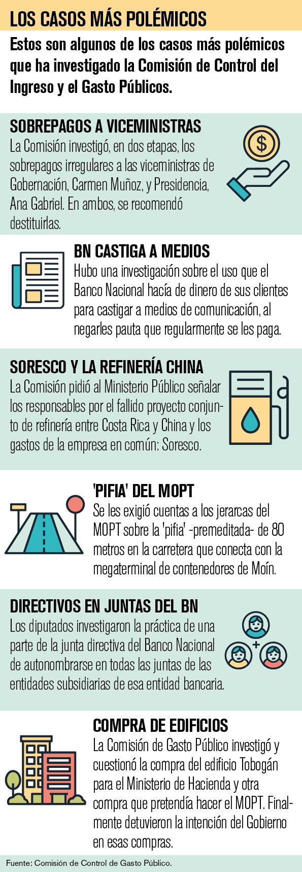 La Comisión sobre Gasto Público, conformada por nueve diputados de diversos partidos, existe desde hace 26 años y, en ella, el PAC tiene dos plazas. Este es uno de los foros más polémicos y candentes del Congreso. Por sus sesiones pasan las investigaciones más fuertes, algunas relacionadas con casos de corrupción, como en el pasado sucedió con la construcción de la trocha fronteriza, o de despilfarro de fondos públicos, en general.