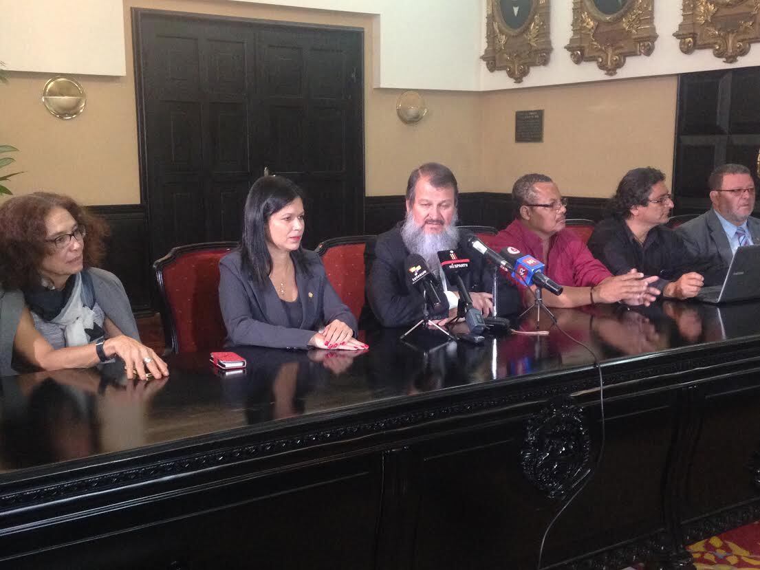 Al centro, el jefe de fracción del Frente Amplio, Gerardo Vargas, quien apoya la protesta que organiza Ronaldo Blear (a la derecha), del sindicato de muelles de Limón y Moín. (Aarón Sequeira)