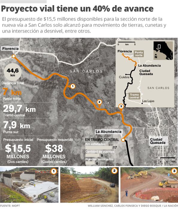 Según explicó Solano, el Estado disponía de $15,5 millones, financiados por el Banco Interamericano de Desarrollo (BID), para hacer dos carriles entre las comunidades sancarleñas La Abundancia y Florencia. Sin embargo, en enero de 2016, se decidió agregar dos carriles siguiendo una recomendación del Laboratorio Nacional de Materiales y Modelos Estructurales (Lanamme).