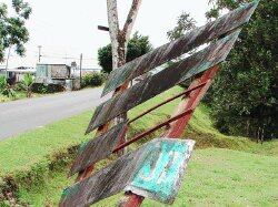 Los conductores deben bajarse de su auto para adivinar que debajo del barro y el herrumbre esta señal indica cómo llegar a La Fortuna, Florencia, el volcán Arenal y Ciudad Quesada, en San Carlos. | CARLOS HERNÁNDEZ PARA LN