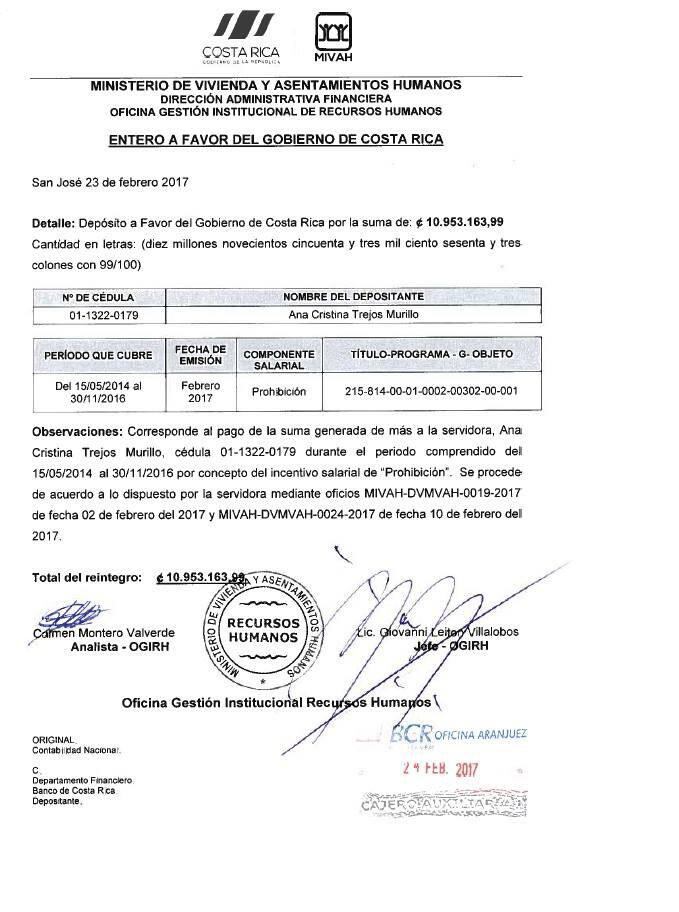 Para pagar esos ¢10 millones, la viceministra solicitó un préstamo personal. Según Trejos, tiene más de dos meses esperando una respuesta a la propuesta de arreglo de pago que le hizo a la oficina de Recursos Humanos del Ministerio de Vivienda.