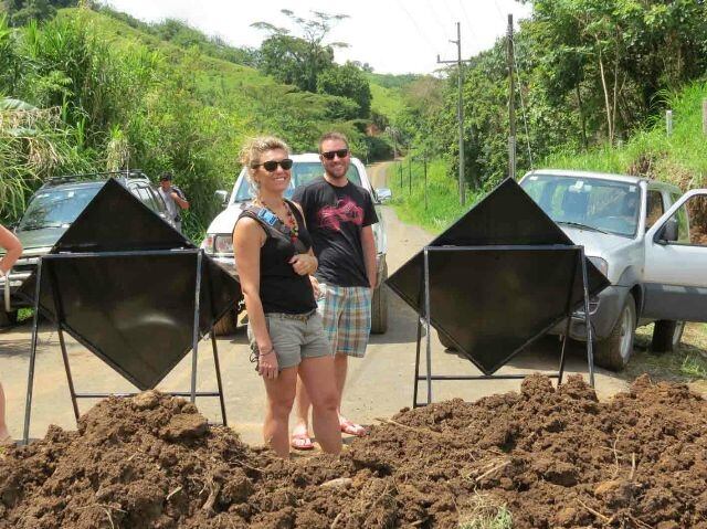 Tales barreras de tierra obligaron a turistas extranjeros, entre ellos los españoles Gema Blas y Saúl Garrido, a devolverse al centro de La Unión y luego tomar un camino alterno que lleva hasta Nuevo Arenal.