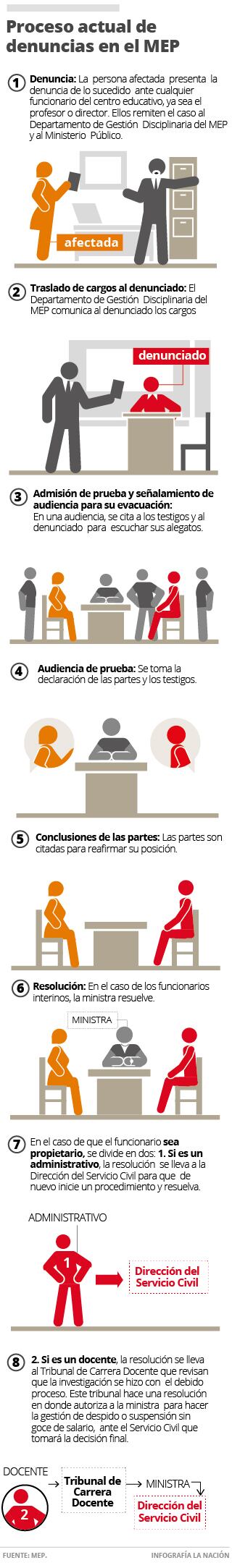 Procedimiento. Actualmente, una denuncia por hostigamiento sexual en el MEP se investiga hasta tres veces, por distintos órganos, lo que según Zúñiga, permite la impunidad y la revictimización del denunciante.