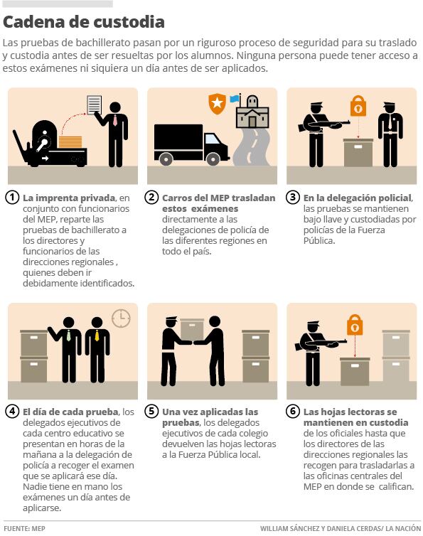 El MEP las entrega directamente al director regional de cada localidad, en cajas envueltas con sellos de seguridad. La persona debe firmar un documento donde deben detallar cómo recibió las pruebas, el estado de las cajas, los sellos, etc.
