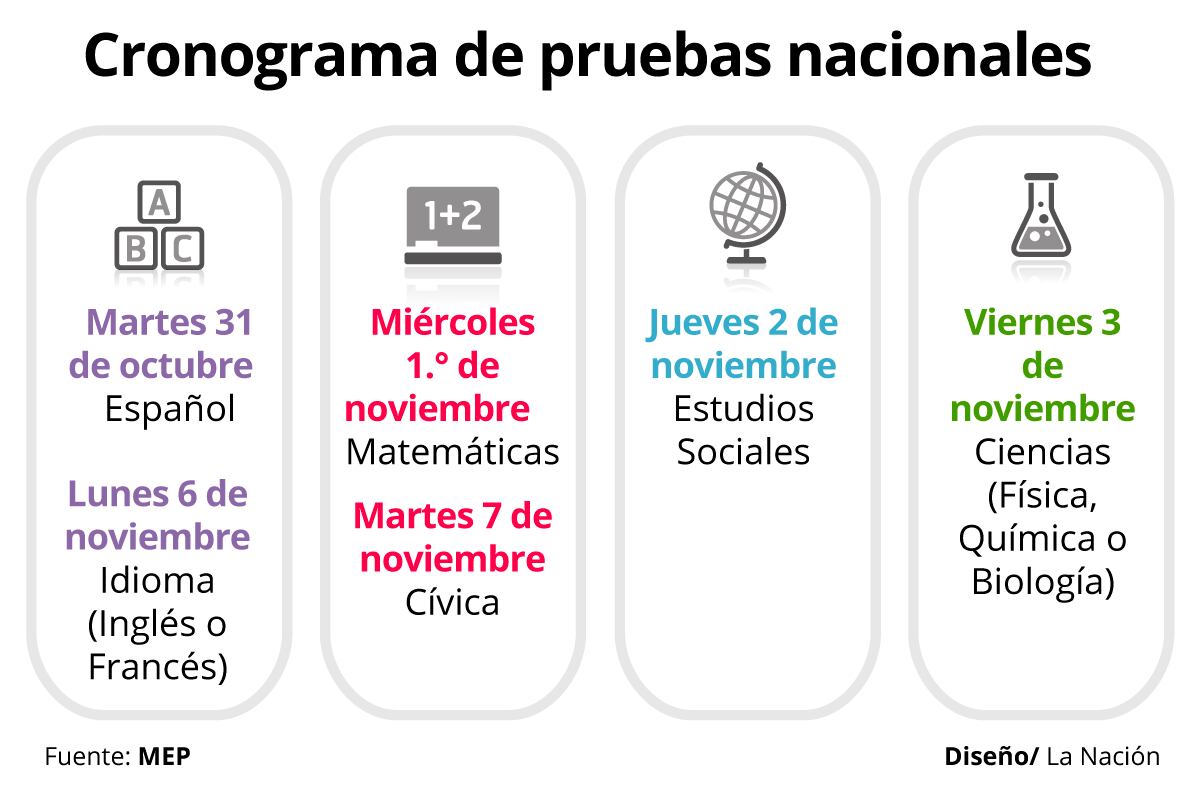 Los exámenes de Español, Estudios Sociales, Cívica, Ciencias e Idioma constarán de 60 preguntas de selección única. En el caso de la prueba de Matemáticas, tendrá un 85% de preguntas de marcar con "x" y un 15% de resolución de problemas.