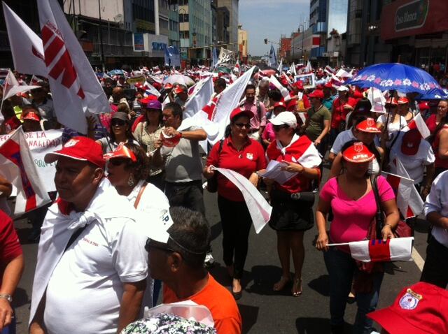 El gremio de la APSE convocó a la marcha para manifestar la oposición al salario único, a la reforma procesal laboral, al impuesto sobre la renta y sobre los derechos de los trabajadores que son incapacitados por la Caja Costarricense de Seguro Social (CCSS).