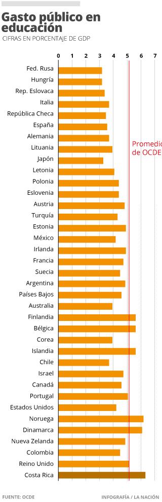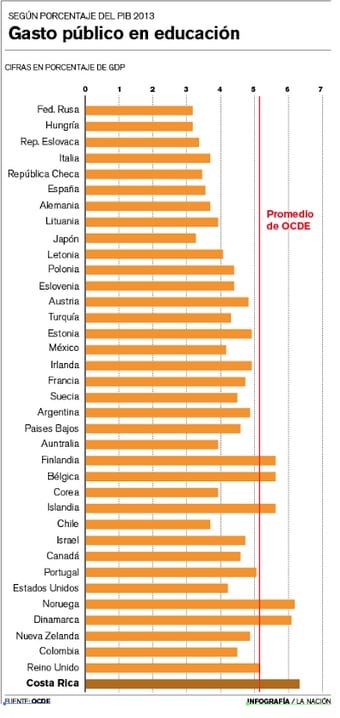 Costa Rica invierte más en educación que los 35 países miembros de la Organización para la Cooperación y Desarrollo Económicos (OCDE), que incluye naciones como Finlandia o Alemania. Sin embargo, esa inversión no se refleja en el desempeño de sus estudiantes.