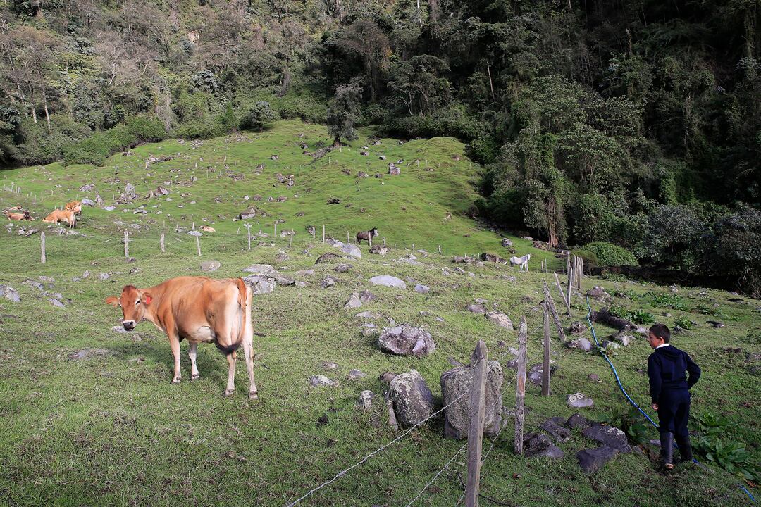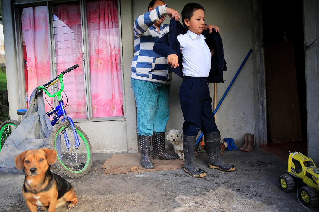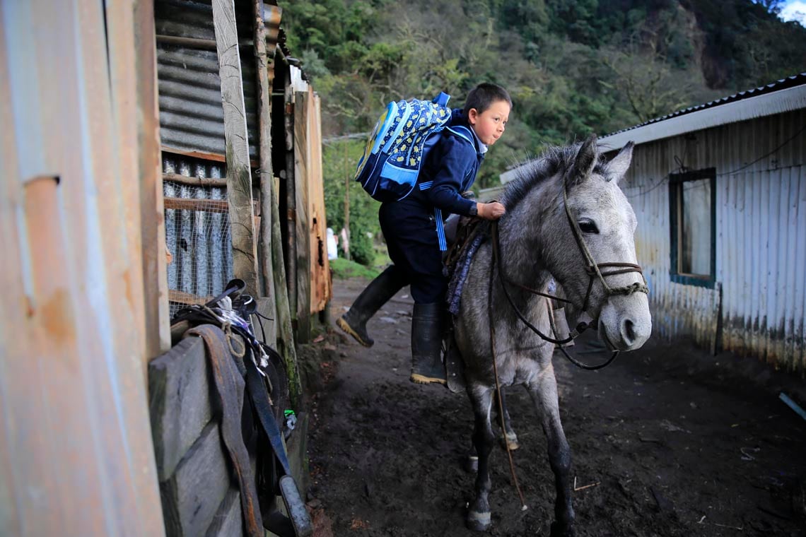 Tras alistar su bulto y tomar café, el niño se puso las botas y alistó el caballo que lo llevaría al centro educativo. Su madre le puso el abrigo poco antes de su partida.