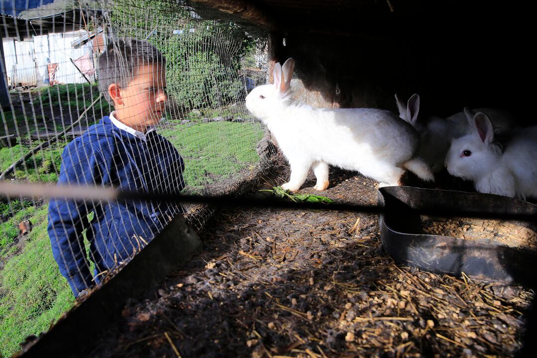 Aún vistiendo el uniforme de la escuela, José Adán se dispuso a jugar con los conejos, como si sus vacaciones no hubieran terminado.