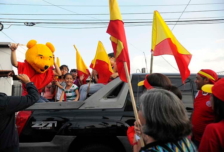 Las banderas del Partido Acción Ciudadana, las pitoretas y las porras a favor de Luis Guillermo Solís llenan de color y ruido las cercanías de la rotonda de la fuente de la Hispanidad, en San Pedro de Montes de Oca, desde las 4:30 p. m.