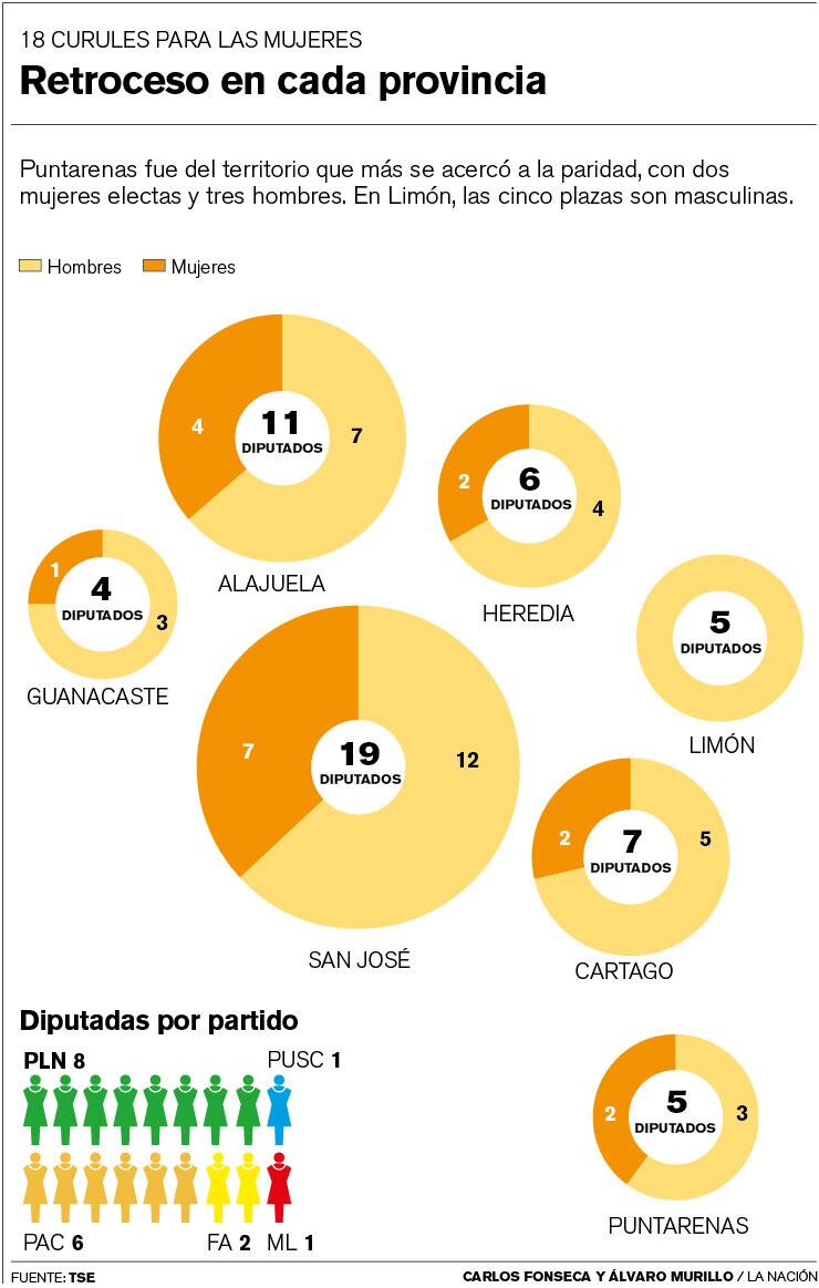 Hay, incluso, una provincia en la cual todos sus representantes son hombres: Limón. Los cinco parlamentarios electos encabezaban sus papeletas en las elecciones del 2 de febrero, mientras que el segundo lugar era para mujeres, pero los votos no alcanzaron para ellas.