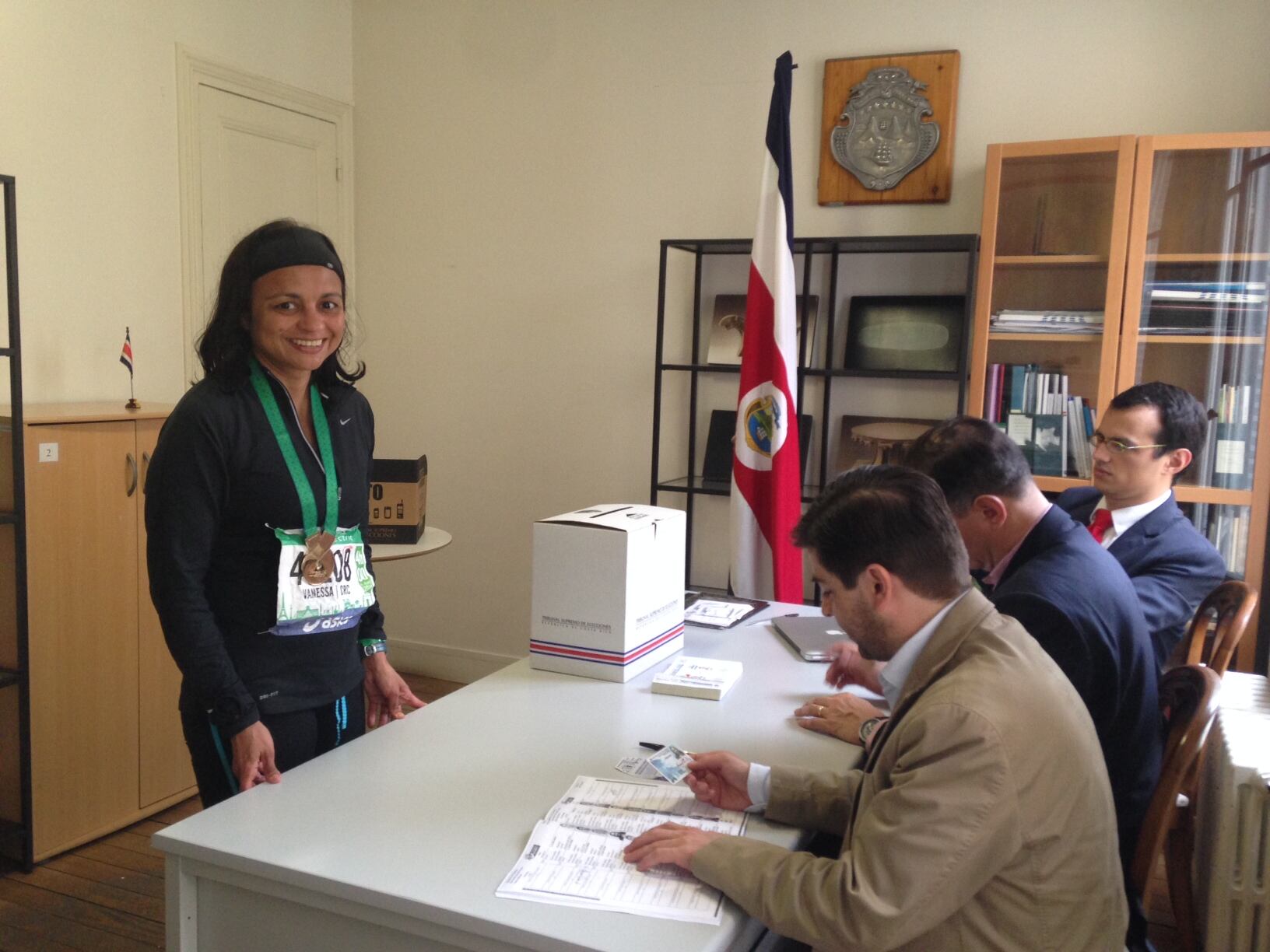 El haber corrido 42.195 metros hoy en la maratón de París no fue un obstáculo para que la costarricense Vanessa Retana acudiera a la mesa de votación en Francia para ejercer su derecho al sufragio.