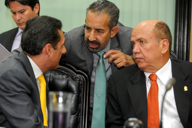 El jefe del PLN, Juan Luis Jiménez Succar (centro), conversa con Antonio Álvarez Desanti (corbata amarilla). Ambos coinciden en que es necesario aprobar la FIV. Los escucha el jefe del PUSC, Rafael Ortiz Fábregas. | L. NAVARRO (Luis Navarro)