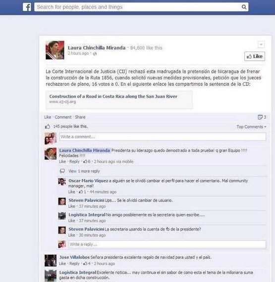 Inmediatamente después de la publicación de la presidenta, apareció un comentario, hecho vía teléfono celular, de alguien llamado “Laura Chinchilla Miranda” y con una foto de perfil idéntica a la del muro de Chinchilla, donde felicita a la gobernante por el nuevo triunfo diplomático en La Haya.