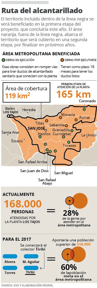 Las obras a cargo del Instituto Costarricense de Acueductos y Alcantarillados (AyA) permitirán llevar los residuos de hogares, industrias y comercios hasta la planta de tratamiento Los Tajos, en La Uruca.