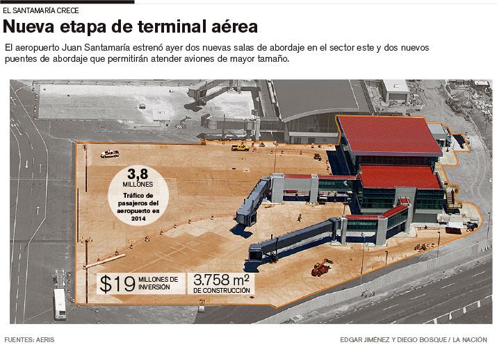 El aeropuerto internacional Juan Santamaría estrenó este martes dos salas de pasajeros y dos puentes de abordaje que permitirán aumentar en un 20% la capacidad de tráfico anual de esa terminal.